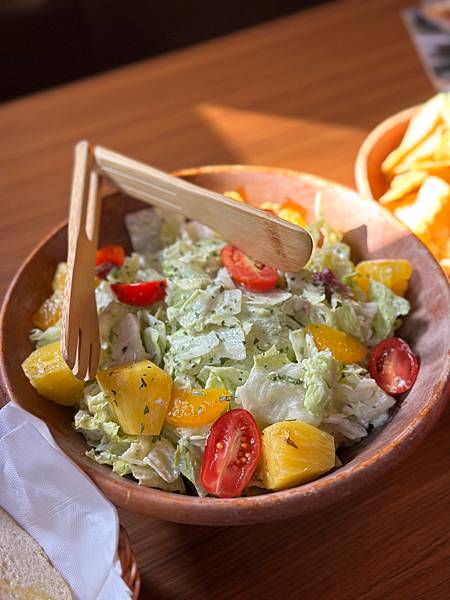 一大盆的生菜沙拉,加入橙汁優格醬,配上鳳梨、柳橙和小番茄,整體吃起來十分清爽
