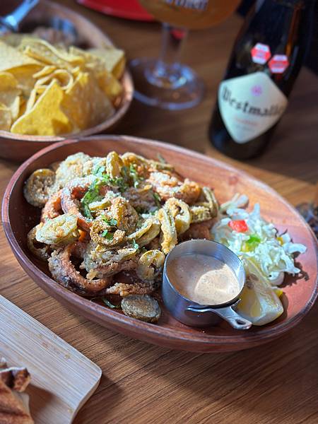 墨西哥版的酥炸魷魚,搭配經典的墨西哥沾醬-蒜味美乃滋。淋上檸檬汁,再搭配酥炸墨西哥辣椒~酥酥脆脆的好好吃,很推薦😍😍😍