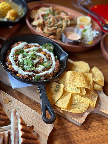 以牛絞肉為主加入墨西哥香料、辣椒片、玉米粒等等,香辣濃郁~搭配旁邊附上的玉米脆片。一口接一口很唰嘴🤤🤤