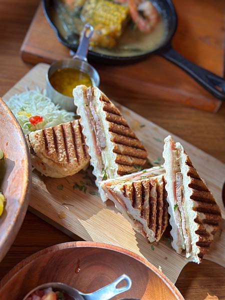 經典的古巴三明治。燒烤肉片加上墨西哥辣椒、洋蔥、和起司、美乃滋,交疊在一起成為經典的美味。